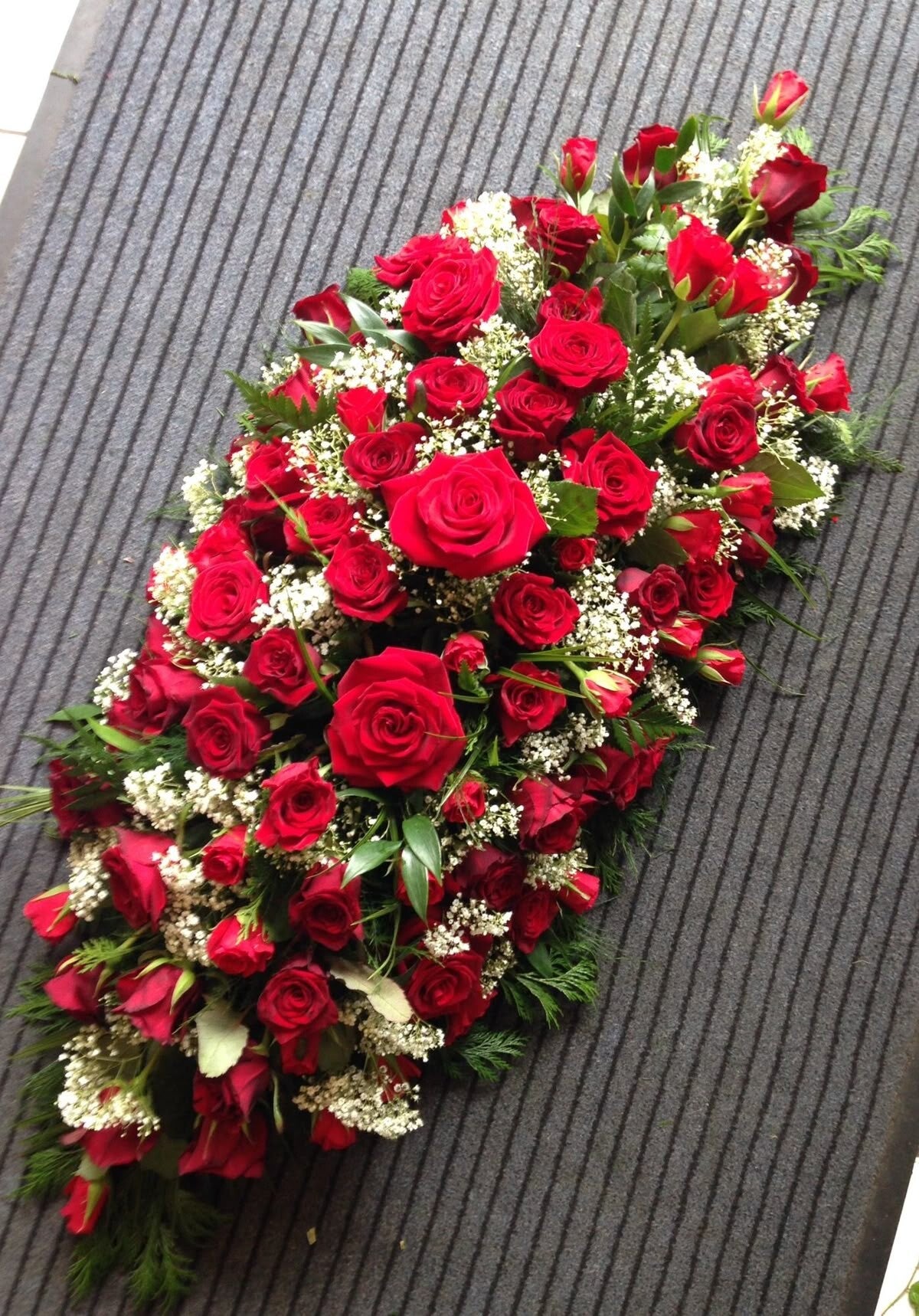 Fleurs utilisées : souvent des roses, lys, gerberas, chrysanthèmes ou autres fleurs symboliques.