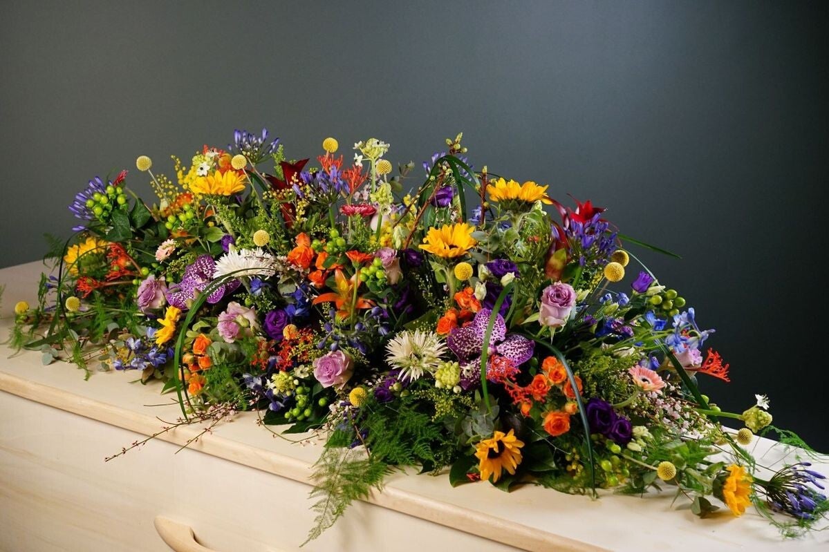 Fleurs utilisées : souvent des lys, roses, gerberas, chrysanthèmes ou fleurs de saison, selon le souhait des proches.