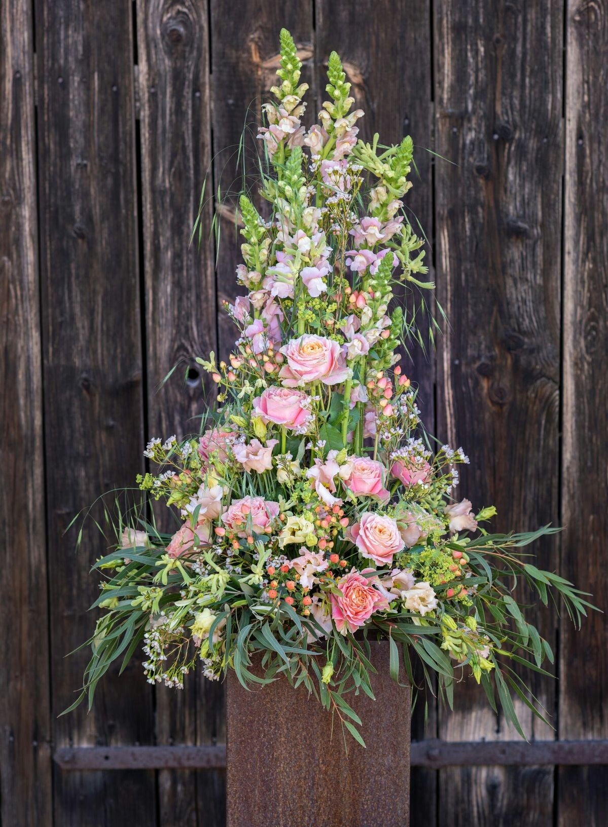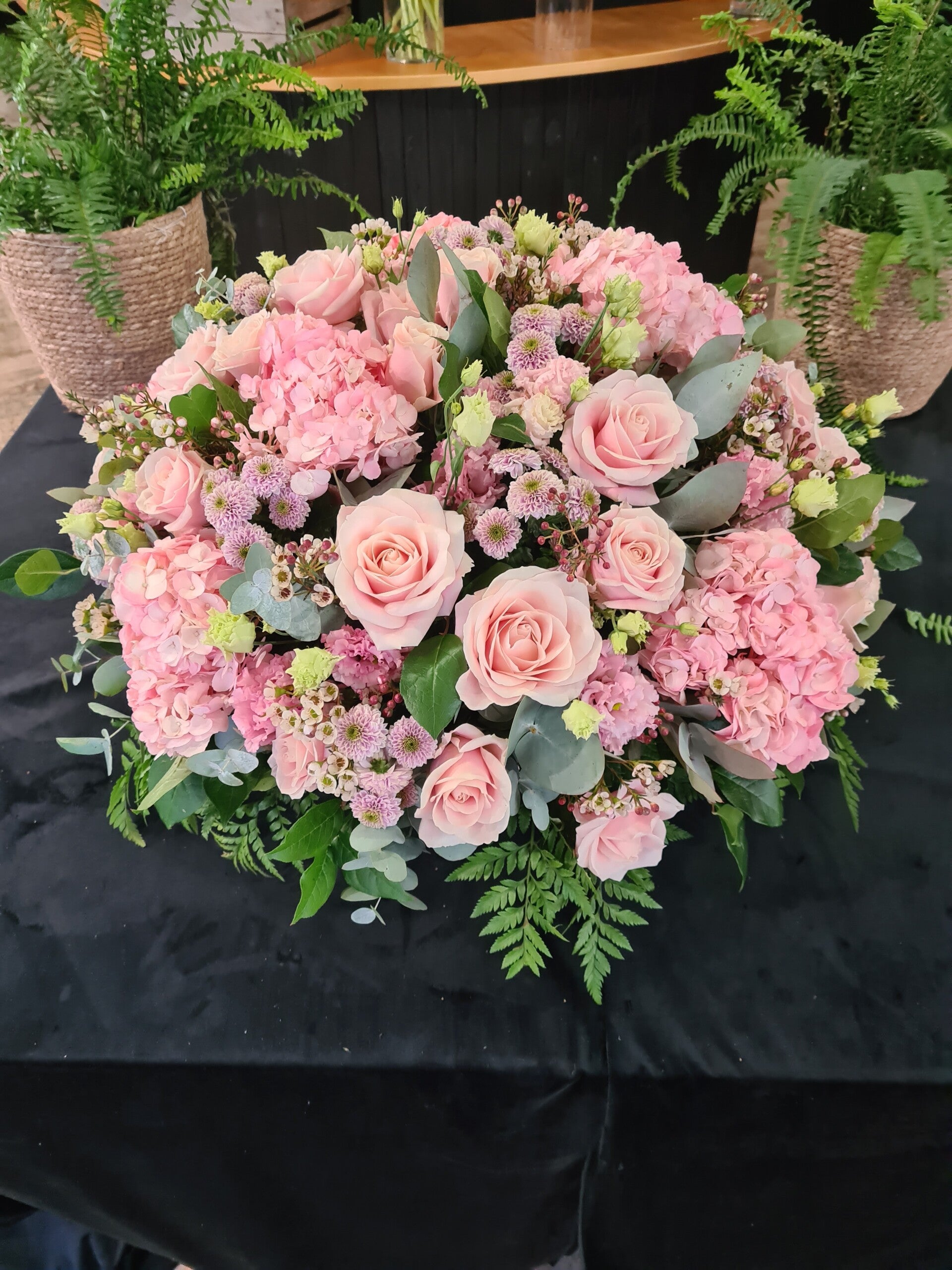 Structure : réalisée sur une base en mousse humide, les fleurs y sont piquées une à une pour assurer volume et fraîcheur.